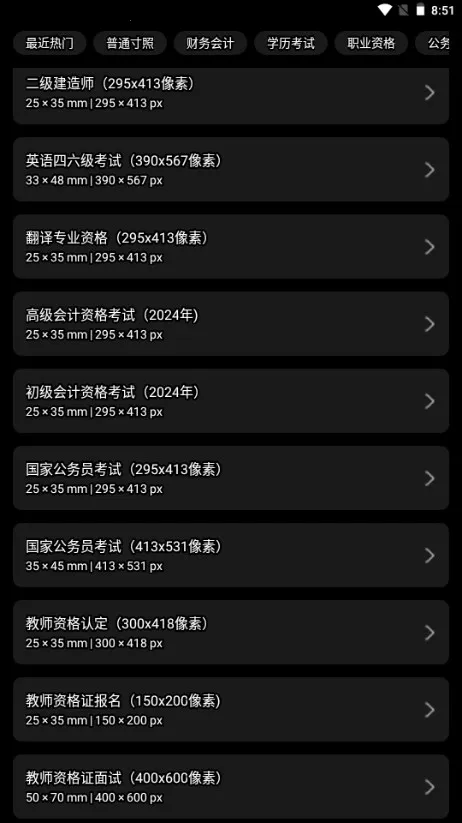 3、适配性强:提供红蓝白等多种标准证件照底色,支持一键切换并实时预览效果;尺寸库涵盖基础标准尺寸、各国签证照片规格、各类考试报名专用尺寸,按场景分类,能满足求职、考试报名、证件办理等多场景需求。