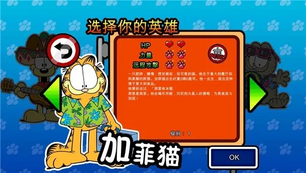 1. 游戏玩法简单易上手,操作跟暴力板儿砖类似,点击屏幕左右控制加菲猫移动,点击技能图标进行召唤伙伴、释放技能、升级等级等操作,玩家可根据策略合理分配。
