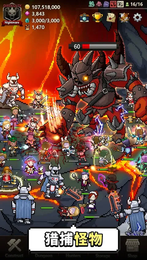 2. 双线程玩法设计巧妙,挂机战斗与村庄经营并行不悖,猎人小队自动讨伐魔物获取资源,村长同步规划建筑升级装备制造与猎人招募。