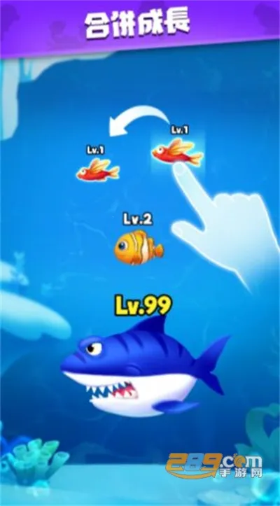 1. 玩家置身深海背景,收集各类鱼并合成升级,防止被其他鱼吞噬,在合并与战斗中壮大鱼群,过程十分过瘾。