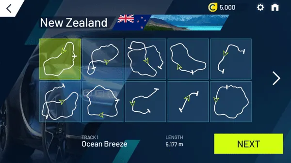 5、获得新的皮肤,就可以开始新的一场赛车比赛了。点击“CAREER”进入游戏场景切换;然后点击“NEXT”选择要比赛的汽车,最后就是点击“PLAY”开始游戏啦!