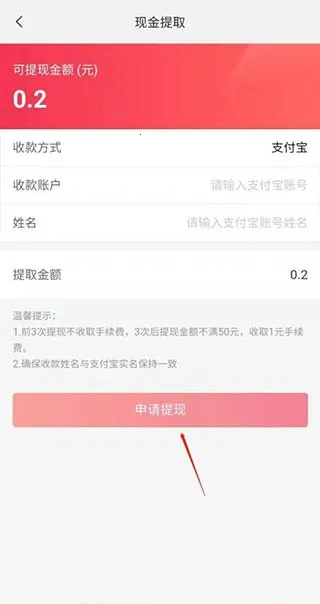 进入返现详情页后,点击「提现」按钮,根据提示输入需要接收返现金额的支付宝账号及真实姓名,确认信息无误后提交申请即可完成提现。