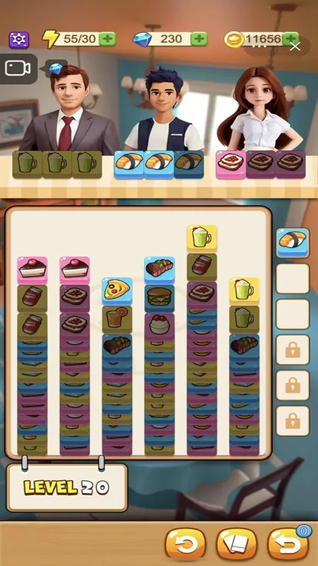 3. 游玩界面是核心玩法界面,每次三个客人出现,各需三张相同食材卡。下方有多列食材卡牌叠加卡柱,点击选取最上层卡牌,符合客人要求则飞到客人下方,不符则先到公共等待区,满足需求可消除卡牌。