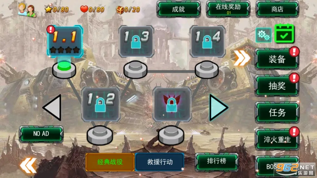 2. 多种精良武器和技能道具可解锁升级,火箭追踪炮、电离子枪、加特林都是必杀神器。