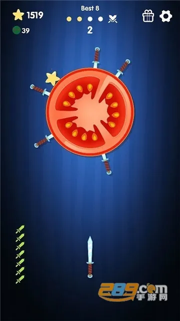 1. 真实物理模拟,刀具抛射遵循重力惯性与旋转动量,刀尖朝下精准钉入目标。