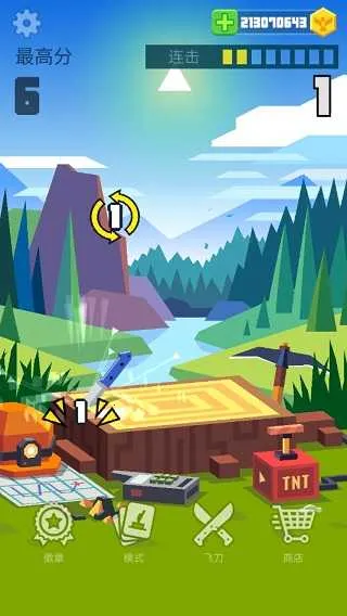 在连击模式中的规则十分简单,游戏开始时我们的刀具将以竖插在树桩中的姿态出场,而我们要做的就是选择刀具不同的部位后将其以一定的力度和方向上拉、到达一定程度后放手:此时刀具就会沿着之前玩家给予的轨迹滑动、旋转,而唯一的要求就是刀具落下时刀尖必须朝下,这样才能继续立于砧板之上。