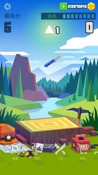 游戏中共有打靶模式、攀爬模式、过关模式和连击模式4种玩法,4种模式各有玩法,也有着自己的规则和特点。不过作为游戏的起点、在进行其他的玩法和尝试其他道具之前最好在连击模式中熟悉刀具的特点和重量后再行游戏。