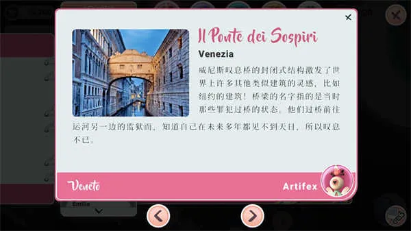 如果你想深入了解意大利的神迹之地,这款游戏绝对是不二之选。它融合了文化探索与逻辑解谜,让你化身埃里奥的继任者,开启一场独特之旅。游戏以超 100 个高精度 3D 重建的意大利地标建筑为关卡,像斗兽场、五渔村等经典场景都有。途中还有五位风格迥异的守护者,代表自然、美食、艺术、表演与设计五大文化主题,帮你梳理意大利文明图谱。通关主线后,600 余篇原创短文解锁,涵盖历史、风物、语言等内容,可作学习素材或出行预习指南。玩法基于视觉识别等,难度梯度平滑,新手和硬核玩家都能兼顾。操作极简,还有辅助道具。除主线,还有文化档案馆等拓展模块。在这里,你能在解谜中感受意大利的历史脉络、民间传说与语言魅力,沉浸体验意大利的文化与风情。