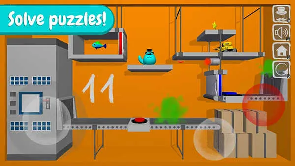 6、当机器人稳稳踩住地面开关时,迅速跃入左侧开启的门内,触碰小鱼即可完成本关挑战。