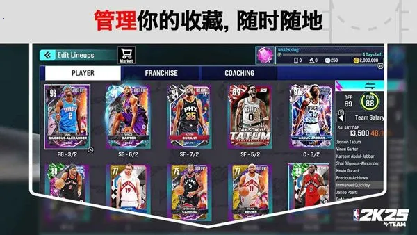 2. 球员阵容强大,包含众多篮球巨星。每个球员都有独特特点,如卡尔投篮包出色、防守强,理查德森进攻好用等,玩家可自由组建理想阵容。