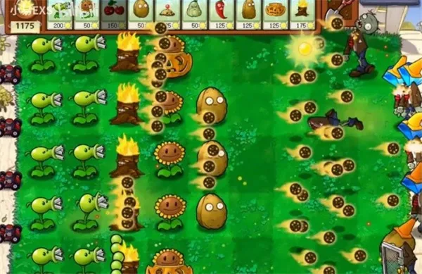 2、注意,有塑料僵尸的就用雪花豌豆或者墙果伺候,很快两排豌豆射手就成形了。
