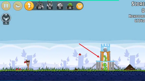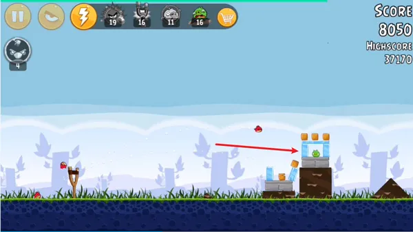 6、第六关全程仅需两只小鸟,过程中瞄准图中冰块最中间的位置就可以了。