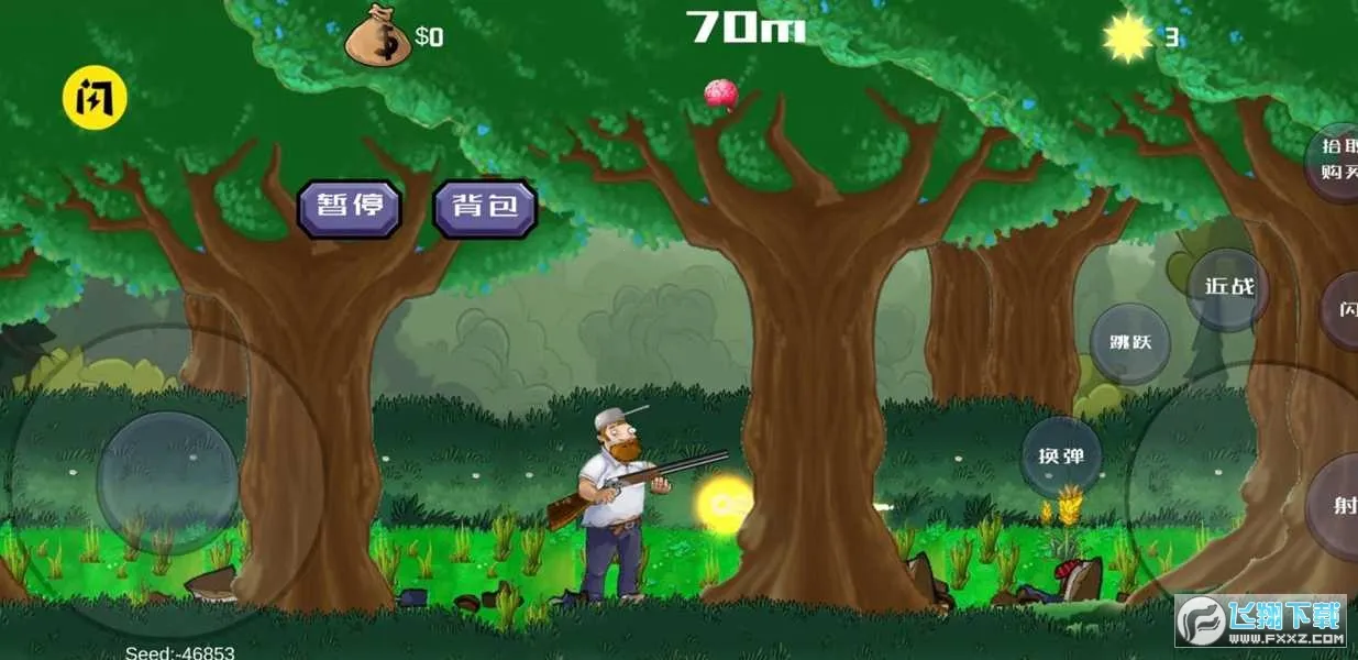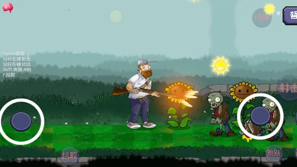 游戏玩法多样,用左下角轮盘控制戴夫移动,右侧有闪避、跳跃、近战、换弹和射击等功能键。戴夫生命值是四个脑子,被僵尸碰到就会损失一个。杀死僵尸能获阳光,可买更强力武器和植物帮手。