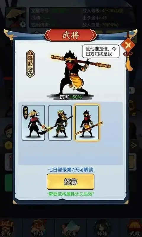 1. 游戏玩法丰富多样,有放置过关斩将、江湖历练等玩法,操作简单,点击即可操控主角攻击敌人,通过击杀敌人获得金币和武魂,进行装备购买和武魂觉醒,提升在武林的地位。