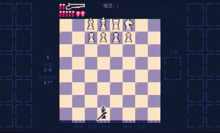 3、策略抉择,每回合可移动国王或射击敌人棋子,装弹后再移动,还有升级选择,需做出明智抉择突破楼层。