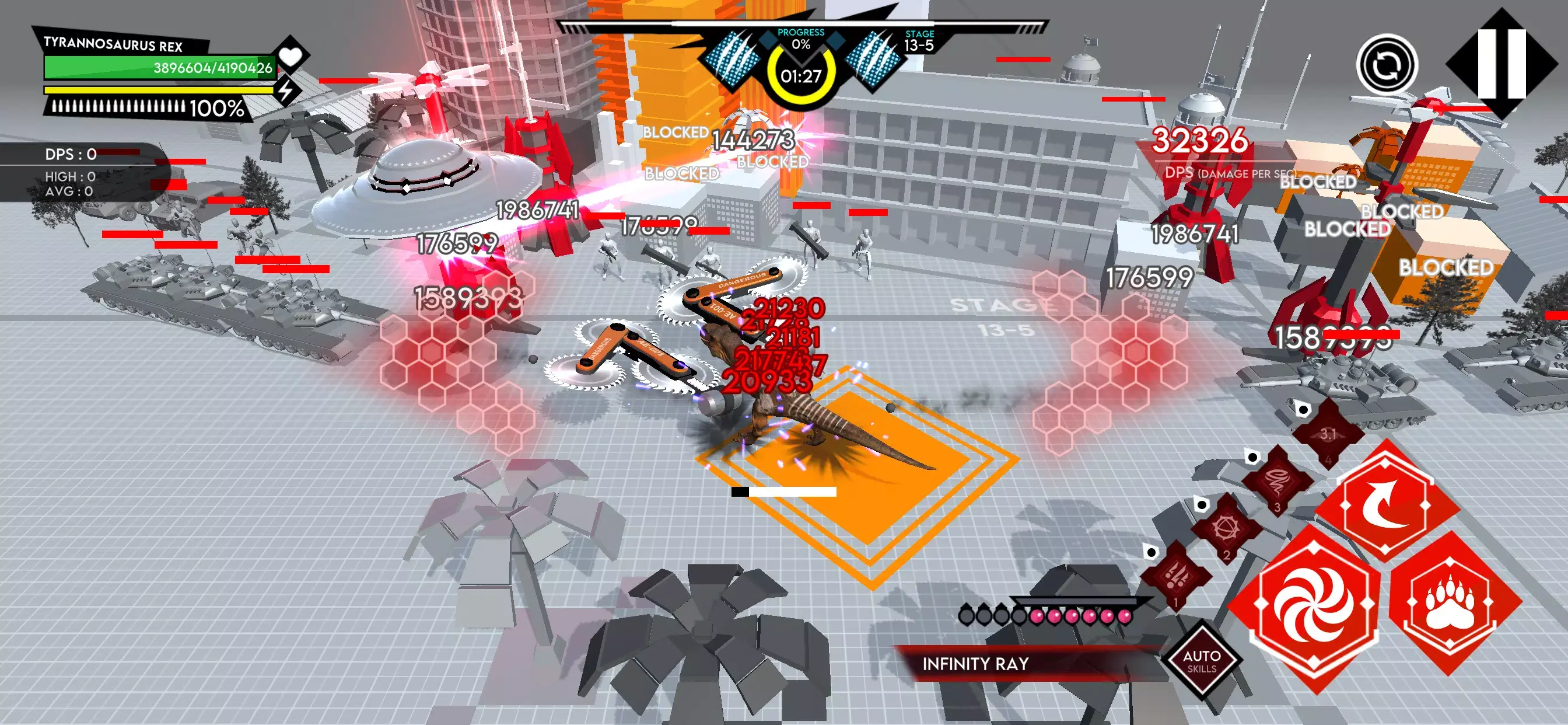2、玩法丰富多样,能控制机甲恐龙霸王龙奔跑冲撞粉碎,还可释放火力,与多种敌军战斗,还有UFO支援和灾难级技能。