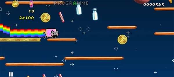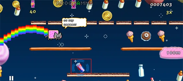 2、玩家控制彩虹猫躲避各种机关陷阱,吃掉东西获得积分,连续点击屏幕还能进行二段跳。