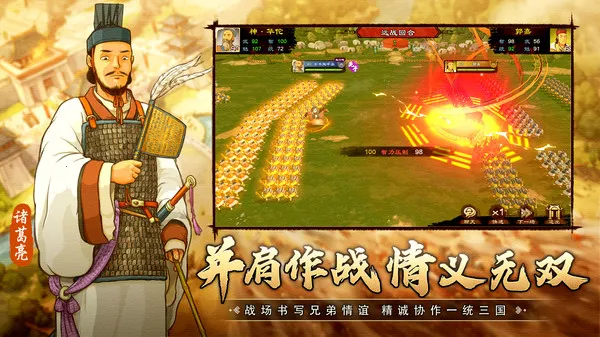 1. 采用手绘涂鸦画风,真实还原三国风貌,精心绘制上百位三国历史名将形象,每个武将都独具个人色彩。