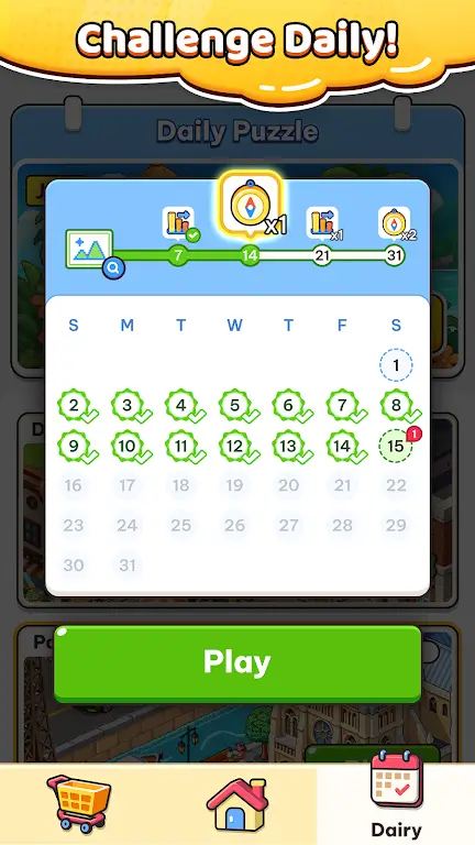 2. 每日挑战保持新鲜感,每天更新全新拼图挑战,考验观察力和空间思维,坚持完成可解锁独特元素,丰富城市细节与故事,让游戏体验充满期待与进步。