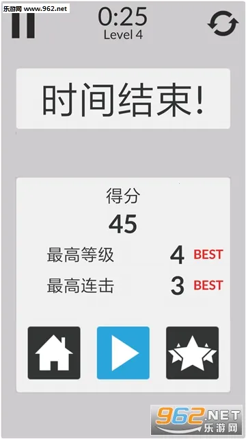 3. 规定时间完成关卡可进入下一关,结束会显示最高关卡数等数据。