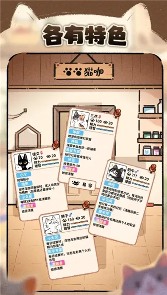 4. 每只猫咪都有不同的立绘,包括胖橘、布偶、狸花等,养成性更强。