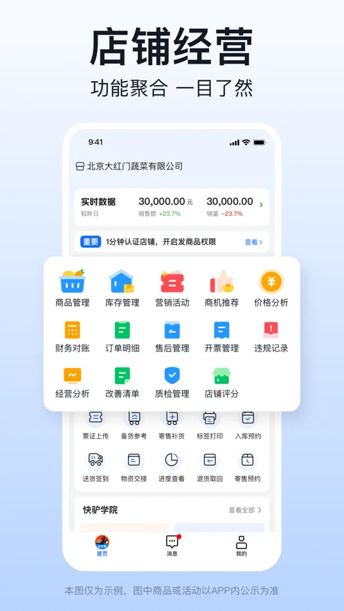 快驴合作商(合作商管理)是为合作商量身打造的业务交互中心,聚合多种功能,涵盖商品管理、订单处理、经营分析等,界面简洁、操作智能,提供一站式服务,支持入驻、加工打印,助合作商高效经营 。